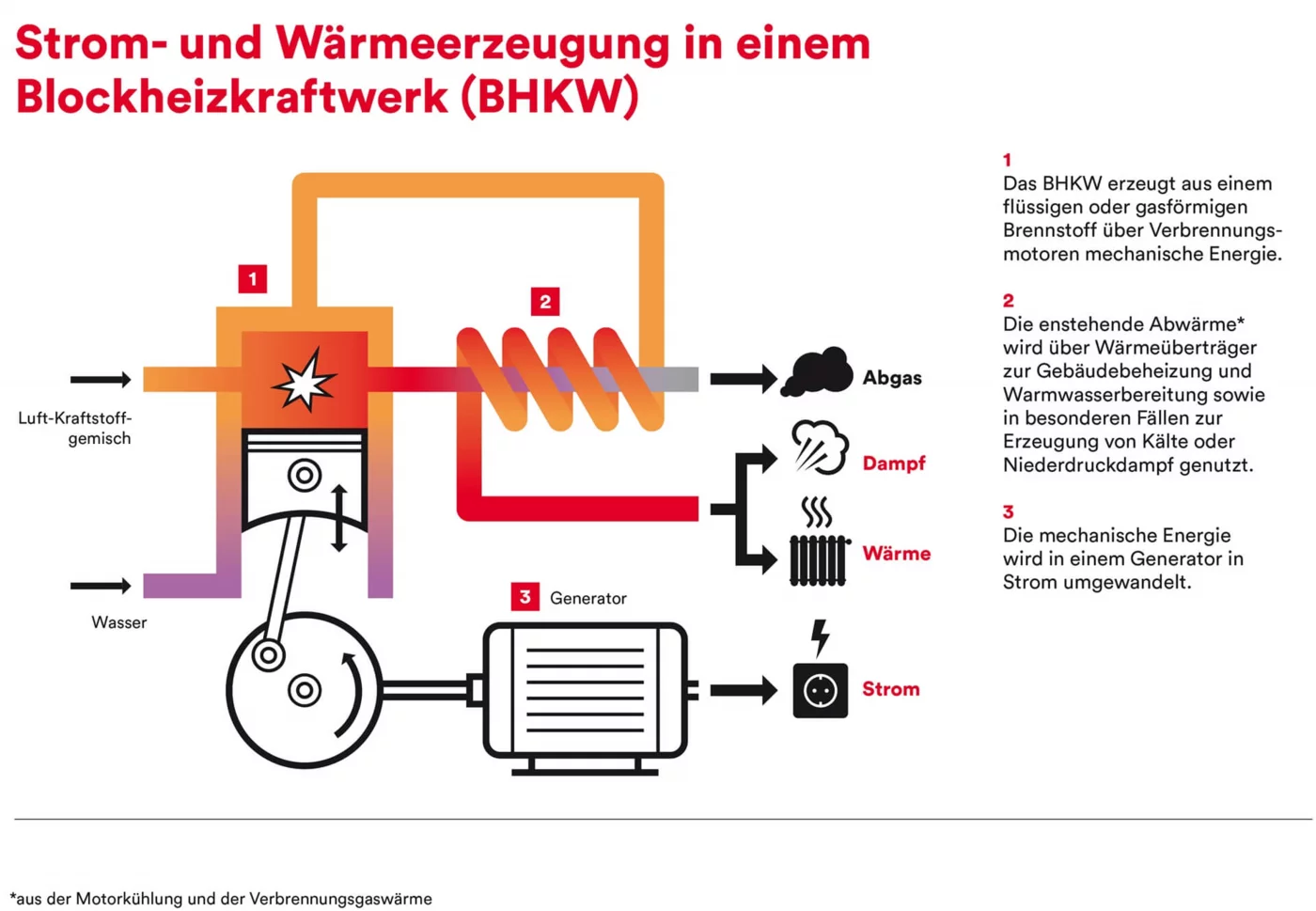 Durch die doppelte Nutzung von Brennstoff mittels Kraft-Wärme-Kopplung (kurz „KWK“) lässt nicht nur die Effizienz steigen, sondern auch Energie sparen. Denn KWK-Anlagen verwenden zur Energieerzeugung Abwärme, die bei der Stromerzeugung ohnehin anfällt. Im Vergleich zur getrennten Erzeugung von Strom und Wärme entsteht zudem auch weniger CO2.