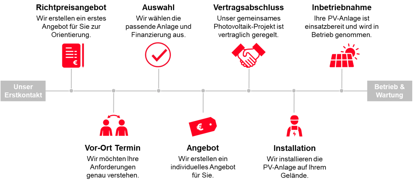 Gestalten Sie Ihre persönliche Energiewende gemeinsam mit uns. Wir begleiten Sie von der Planung bis zum Betrieb, über die gesamte Laufzeit der Anlage und darüber hinaus. Möchten Sie Ihre Energielösungen neben den Photovoltaik-Anlagen noch effektiver gestalten, sind wir als Effizienzpartner an Ihrer Seite.