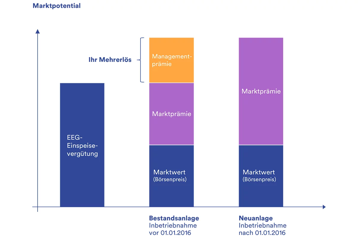 - Der Betreiber der Anlage erhält sowohl die Marktprämie als auch den Marktwert für die von ihm direkt vermarktete Energie.