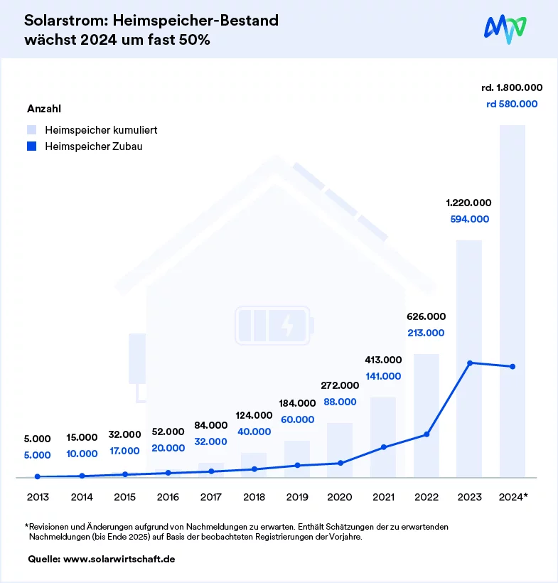 In den Jahren 2023 und 2024 sind in Deutschland jeweils ca. 600.000 neue Batteriespeicher in Betrieb genommen worden. Dabei ist der prozentuale Zuwachs von Großspeichern höher als der von Heimspeichern. Die Kapazität aller in Deutschland installierten Batteriespeicher summiert sich mittlerweile auf ca. 19 Gigawattstunden – genug um zwei Millionen 2-Personen-Haushalte einen Tag lang zu versorgen. Für die kommenden Jahre wird ein weiterhin starker Zuwachs von Batteriespeichern erwartet. Die Gründe sind u.a. stark gefallene Preise und zusätzliche Anreize durch neue gesetzliche Regelungen.