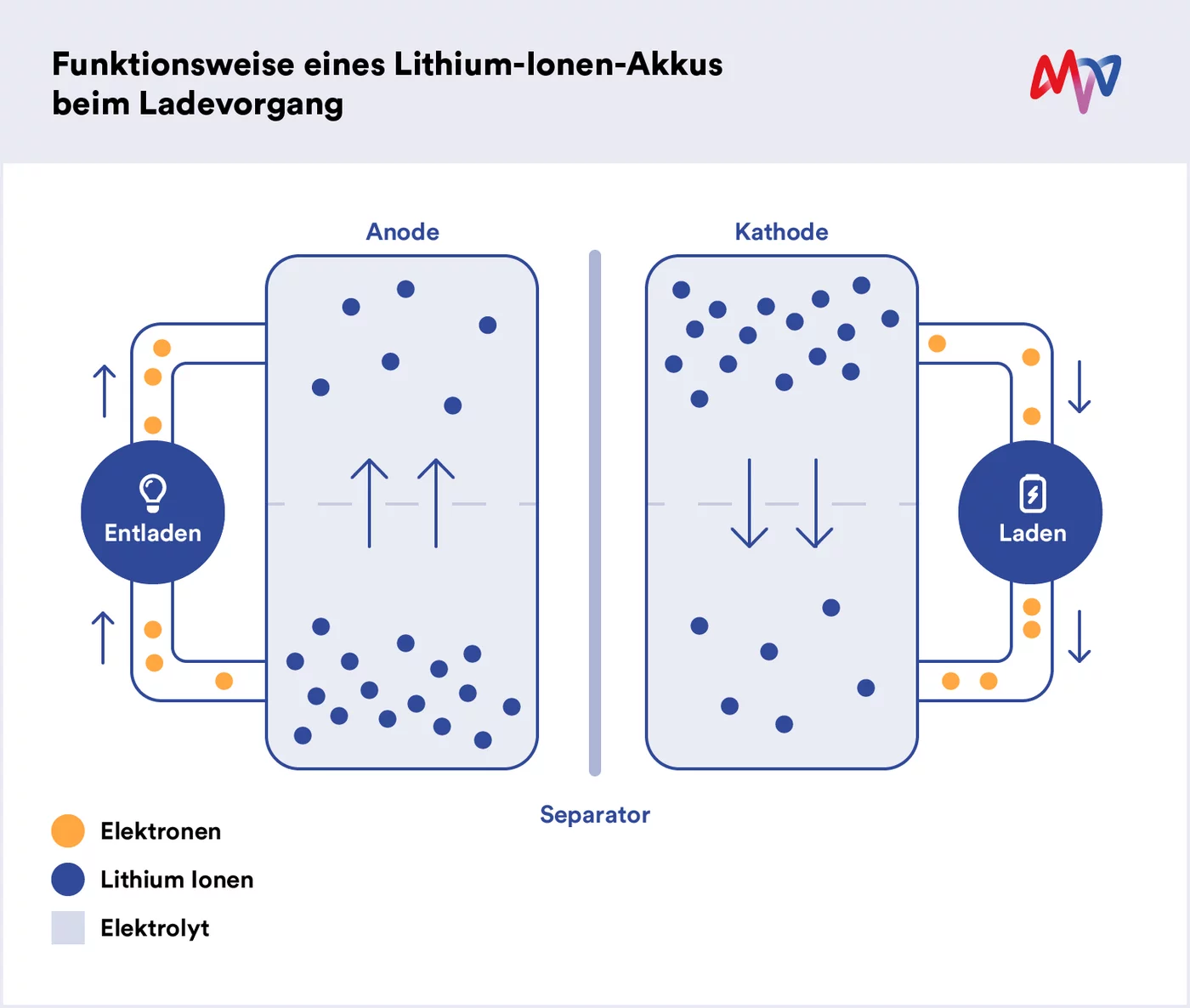 - Ein Elektrolyt – bestehend aus einem Lösungsmittel (z.B. Diethylcarbonat) und gelösten Salzen wie Lithiumhexafluorophosphat.