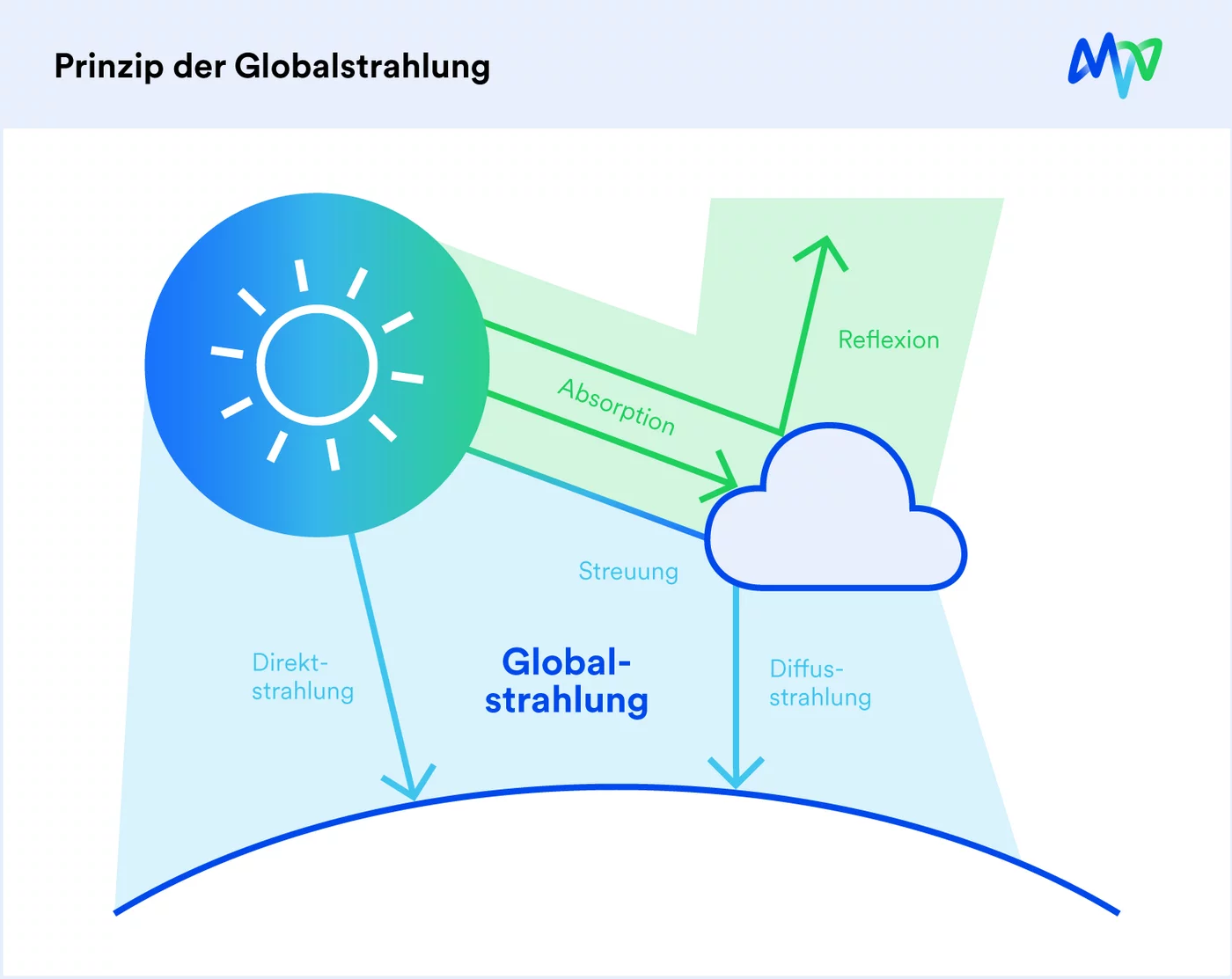 Die Globalstrahlung setzt sich aus zwei Bestandteilen zusammen. Zum einen aus der Direktstrahlung, also der auf direktem Weg auf der Erde eintreffenden Sonneneinstrahlung. Und zum anderen aus der sogenannten Diffusstrahlung, welche die Erdoberfläche indirekt über Streuung an Wolken, Luftfeuchtigkeit und Staubpartikeln erreicht. Sonnenlicht, das auf dem Weg zur Erde vollständig absorbiert oder reflektiert wird, zählt nicht zur Globalstrahlung. Auch die Reflektionen von umgebenden Flächen fließen nicht mit in die Kennzahl ein.