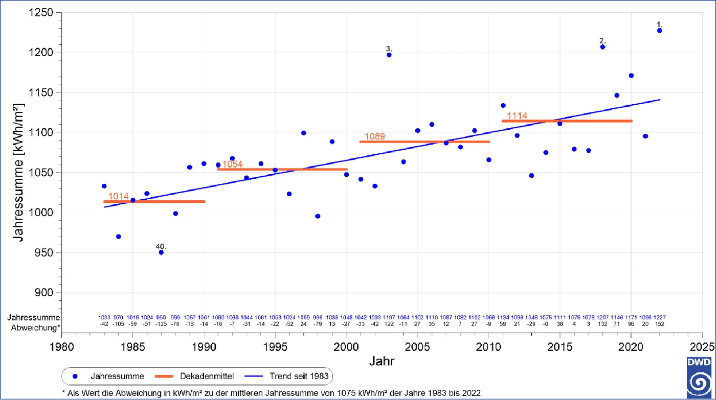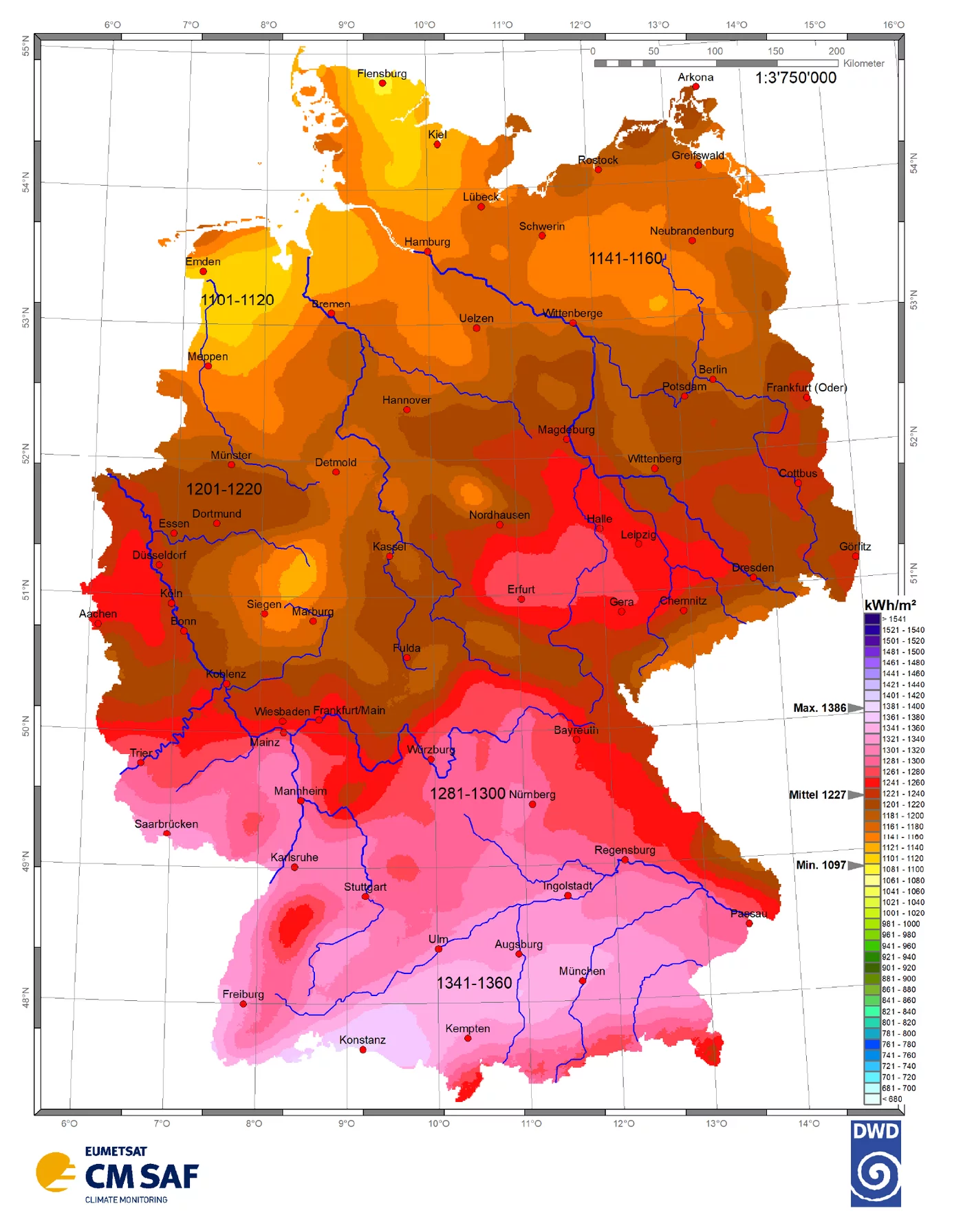 Im Jahr 2022 hat die Globalstrahlung in Deutschland einen neuen Spitzenwert von 1.227 kWh/m2 erreicht. Dabei variierten die Werte zwischen ca. 1.000 kWh/m2 an den nördlichen Küsten und über 1.350 kWh/m2 am Bodensee und im Voralpenland.