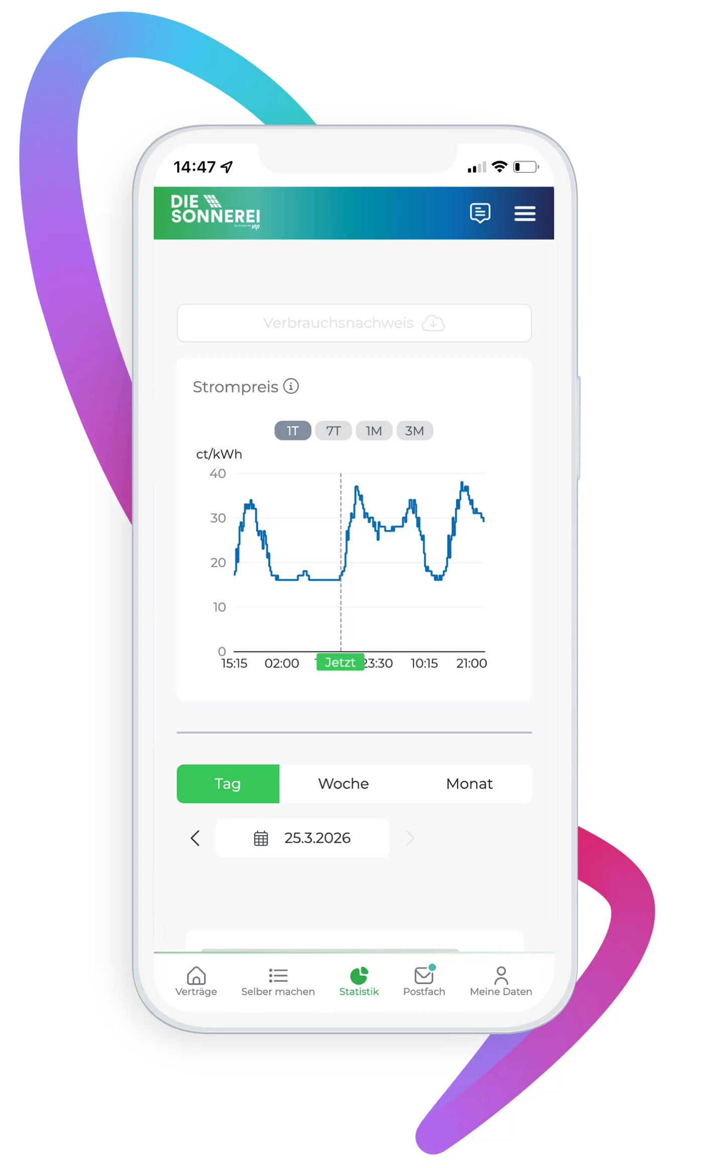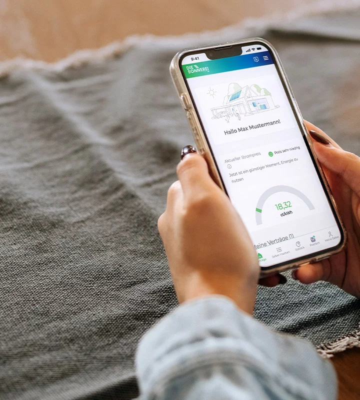 Über unsere Marke "Die Sonnerei" bieten wir Ihnen ein Stromprodukt, das Sie direkt von den aktuellen Börsenstrompreisen profitieren lässt. In Verbindung mit unserem Energiemanagementsystem nutzen Sie automatisch günstige Zeiten zum Strombezug und sparen dadurch bares Geld. Über die Sonnerei‑App behalten Sie jederzeit den Überblick über Ihre Einsparungen, Verbrauchspreise und alle relevanten Dokumente.