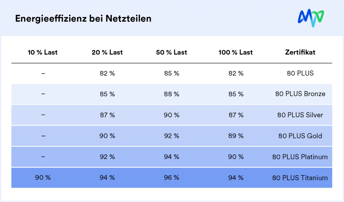 Effizient ist ein Netzteil, wenn die Strommenge, die es aus der Leitung zieht, auch möglichst ungeschmälert beim System ankommt. Ein Beispiel: Das System verbraucht 250 Watt, das Netzteil zieht jedoch 350 Watt aus der Leitung. Die Differenz, nämlich ganze 100 Watt, geht als ungenutzte Wärme verloren. Übermäßige Erwärmung des Netzteils kann daher ein erster Anhaltspunkt für schlechte Energieeffizienz sein. Bei der Neuanschaffung eines Netzteils empfiehlt es sich, auf eine 80Plus-Zertifizierung zu achten. Die unabhängige Initiative 80Plus testet Netzteile auf ihre Effizienz und vergibt Zertifikate von Bronze (85 % Effizienz bei Volllast) bis Titanium (94 % Effizienz). Ab wann sich ein Austausch lohnt, hängt von der Nutzungsdauer und dem Verbrauch des PCs ab.