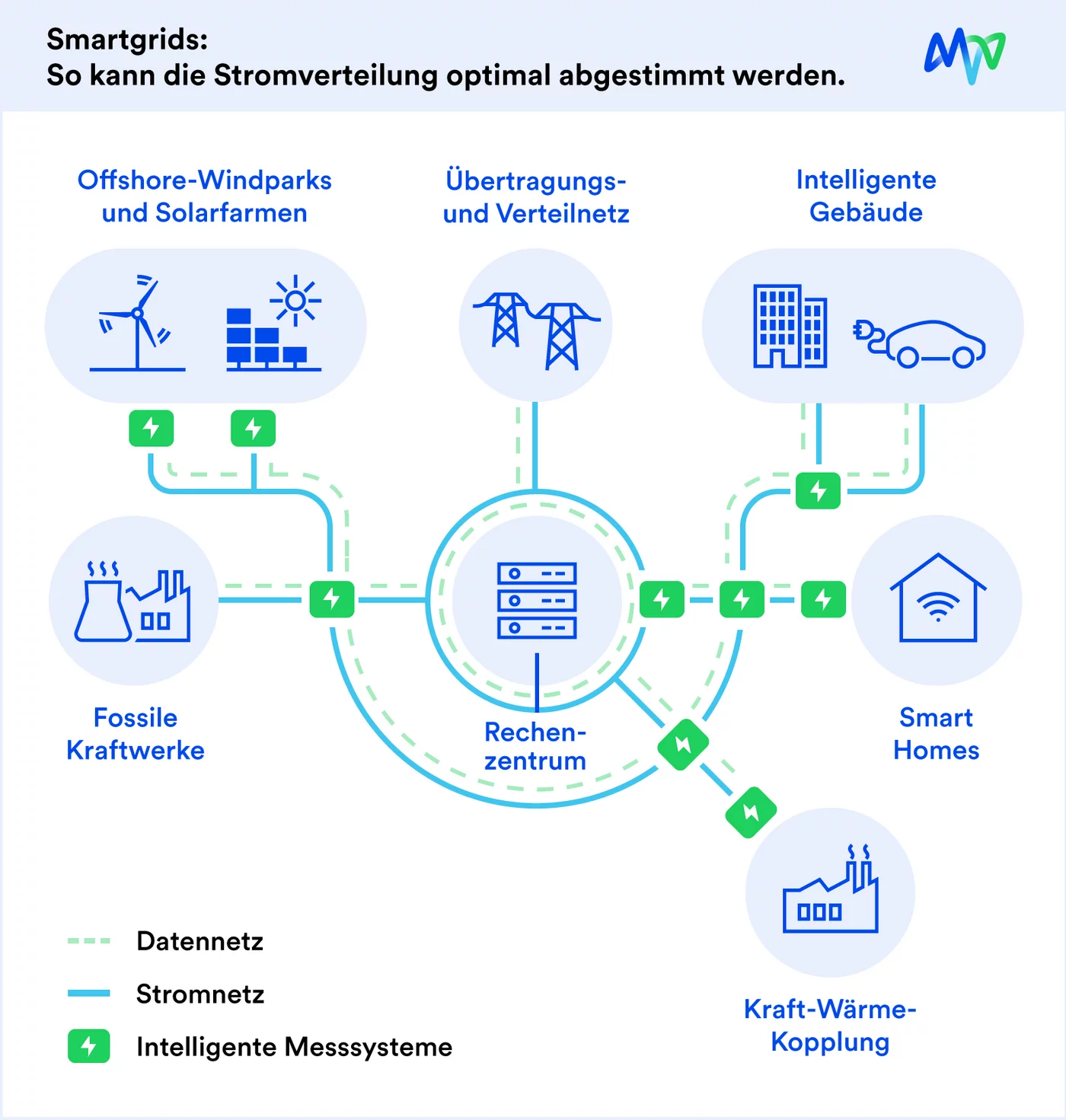 Ein „Smart Grid“ ist ein intelligentes Stromnetz, das neben Strom auch Daten transportiert. Das Ziel: der intelligente Informationsaustausch zwischen Stromerzeugern und Verbrauchern zur dynamischen Steuerung der Netzauslastung und zur optimalen Nutzung von erneuerbaren Energien. Um dies zu erreichen müssen möglichst alle Haushalte mit sogenannten „Smart Metern“ ausgestattet werden.
