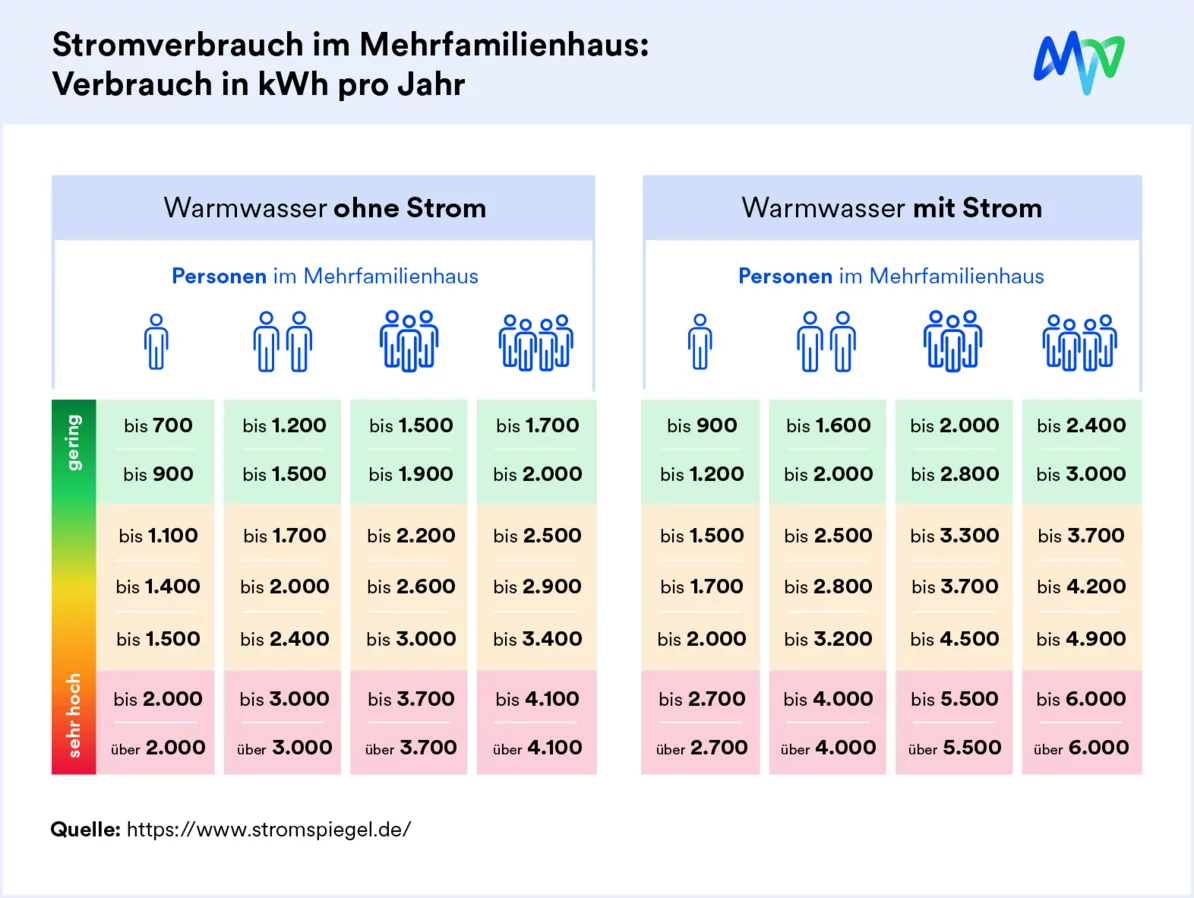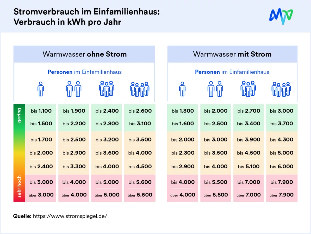 Die folgenden Grafiken geben Orientierung beim Vergleich mit dem durchschnittlichen Stromverbrauch pro Wohneinheit, jeweils in einem Einfamilienhaus und in einem Mehrfamilienhaus für Haushaltsgrößen von 1 bis 5 Personen. Den durchschnittlichen Stromverbrauch pro Kopf kann man errechnen, indem man den Gesamtverbrauch des Haushalts durch die Anzahl der Bewohner teilt: