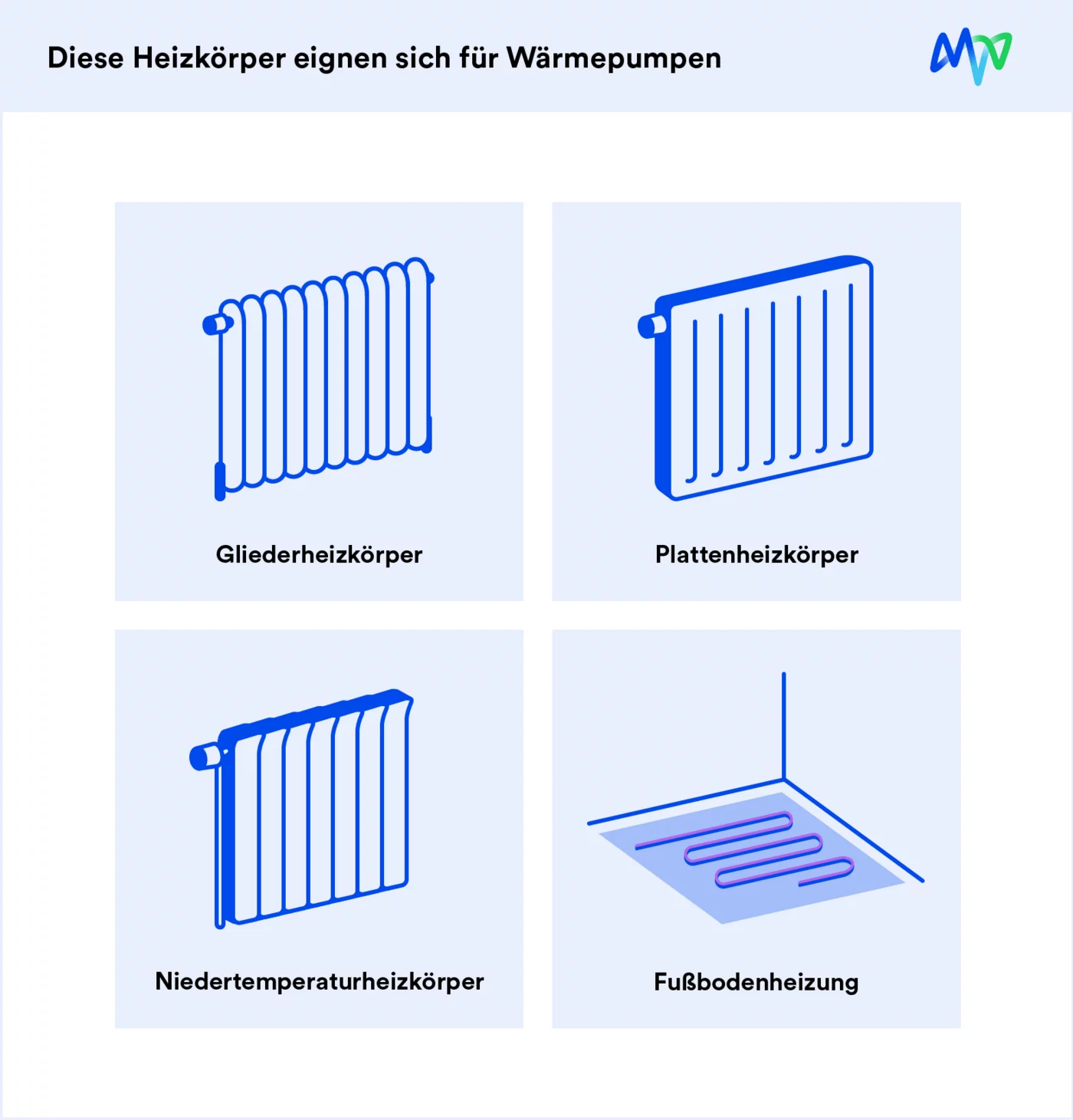 Die folgende Übersicht zeigt, welche Heizkörper-Typen sich für den Betrieb mit einer Wärmepumpe eignen: