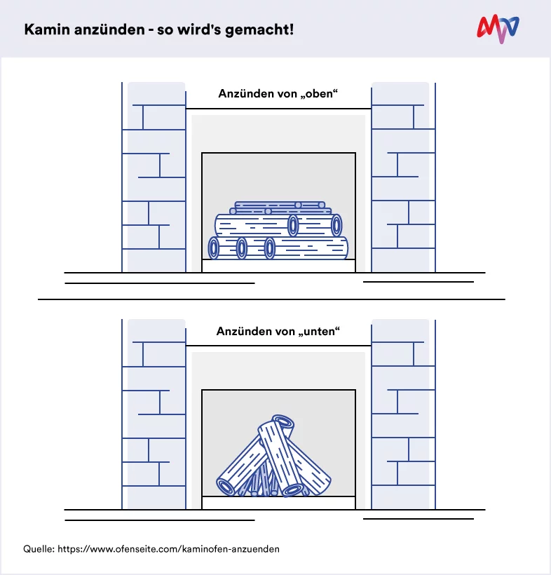 Für das Anzünden des Feuers gibt es zwei Methoden: von oben oder von unten.