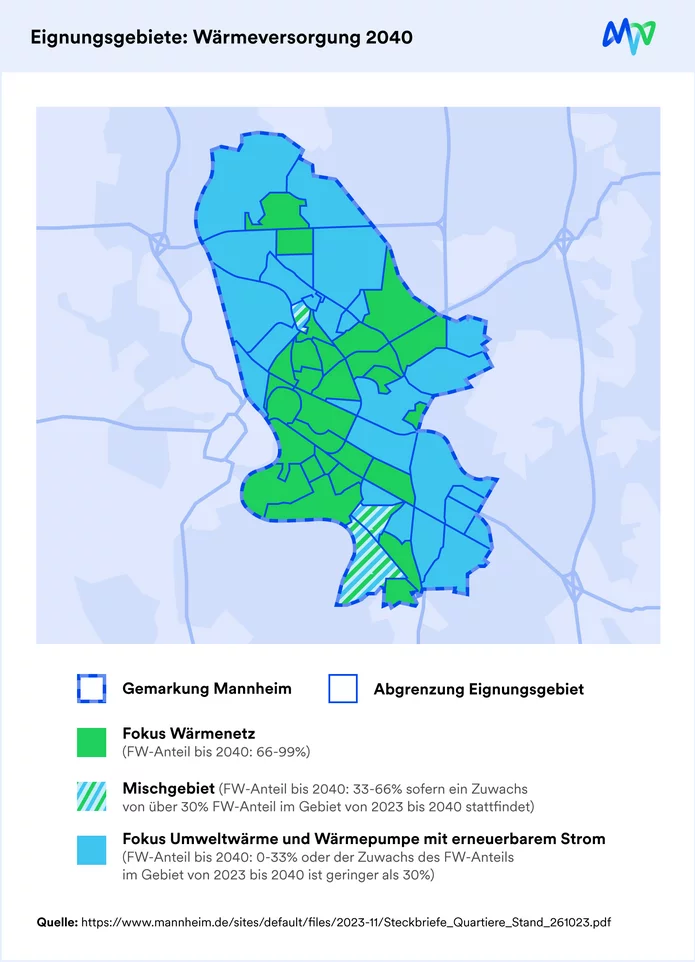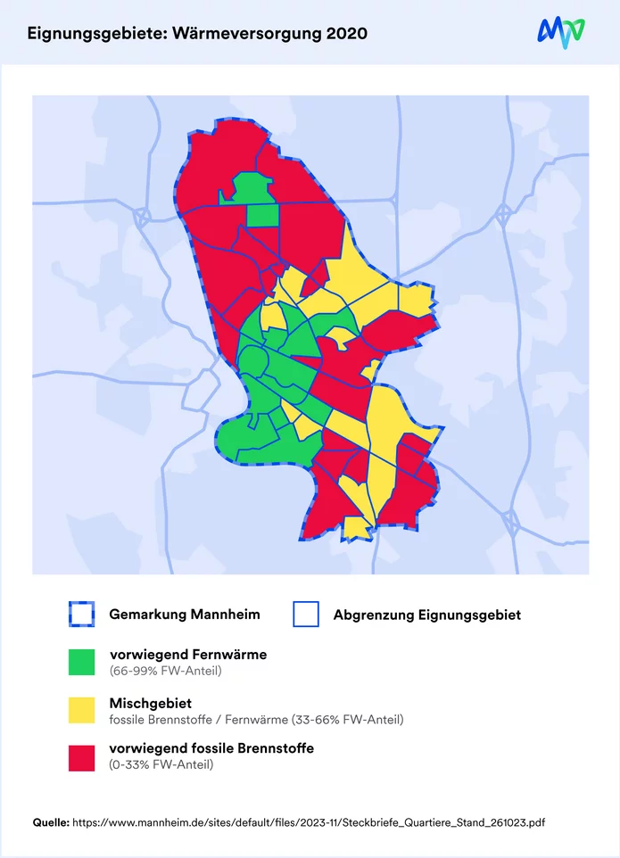 Für Mannheim wird die Klimaneutralität der Wärmeversorgung unter anderem über den Ausbau der Fernwärmeanschlüsse erreicht. So sind viele Bereiche als Schwerpunktgebiete für die Fernwärme gekennzeichnet, da diese besonders nachhaltig ist und bereits heute den konventionellen gas- oder ölbetriebenen Heizungssystemen bezüglich des Treibhausgasausstoßes überlegen ist. Im Jahr 2023 waren bereits ca. 65% der Mannheimer Haushalte an das Fernwärmenetz angeschlossen – und für viele weitere wäre ein Anschluss heute schon direkt möglich. Allerdings sind Schwerpunktgebiete – ob für Fernwärme oder dezentrale Lösungen wie Wärmepumpe – nicht exklusiv auf eine Lösung fokussiert: So kann es sein, dass in Mannheim auch in einem Schwerpunktgebiet für Fernwärme einzelne Abschnitte aus bautechnischen oder wirtschaftlichen Gründen nicht für den Anschluss an Fernwärmenetz erschlossen werden können. Welche Lösung für das persönliche Eigenheim in Frage kommt, kann am besten dem Verfügbarkeitscheck von MVV entnommen werden. Weitere Informationen der Stadt Mannheim zur kommunalen Wärmeplanung sowie Dokumente zum Download sind hier zu finden.