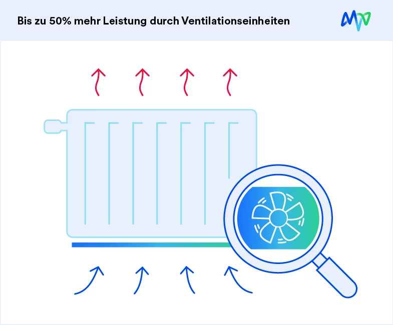 Hier kommen Heizkörperverstärker oder -booster ins Spiel - auf einer Schiene montierte kleine Lüfter, die man unter der Heizung anbringt. Sie erzeugen einen stärkeren Luftstrom, der den Luftkreislauf auch bei niedrigeren Temperaturen in Gang hält: Die erwärmte Luft wird durch den Luftstrom nach oben aus dem Heizkörper ‚geschoben‘, sodass sich in kürzerer Zeit mehr Luft erwärmt und in den Raum abgegeben wird. Diese „erzwungene Konvektion“ soll den Wirkungsgrad eines Heizkörpers erheblich erhöhen.