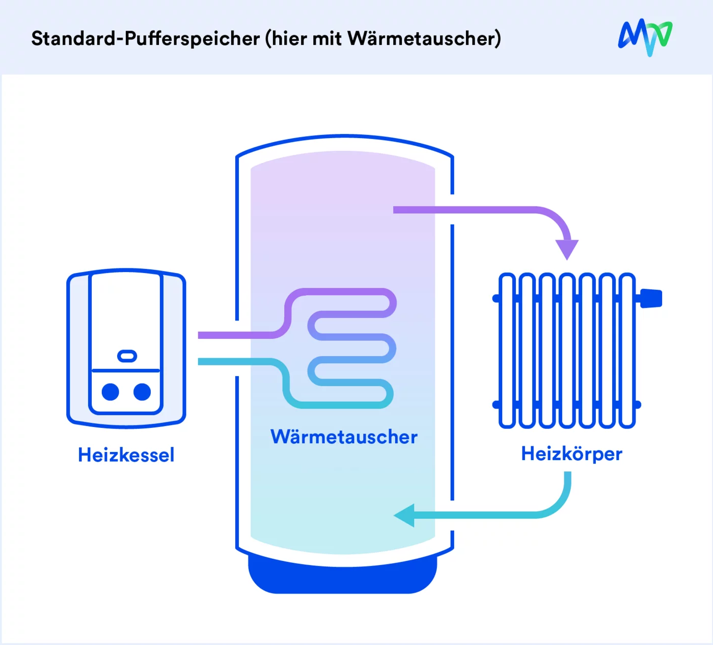 Standard-Pufferspeicher: Das Heizungswasser im Speichertank wird über einen Wärmetauscher erwärmt, bis die gewünschte Temperatur erreicht ist. Bei Wärmebedarf wird das heiße Wasser in den Heizkreis, also zu den Heizkörpern oder zur Fußbodenheizung gepumpt. Einfache Modelle arbeiten ohne Wärmetauscher – hier fließt das Heizungswasser direkt von der Heizquelle in den Speichertank.