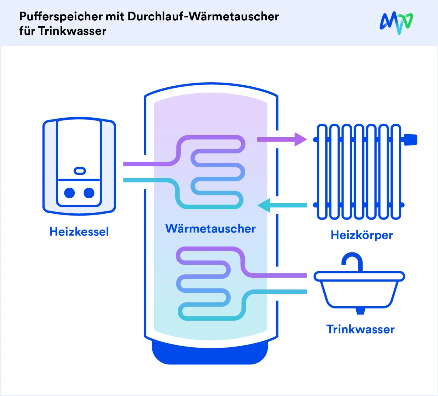 Pufferspeicher mit Frischwassererwärmung im Durchlaufprinzip: Das im Pufferspeicher befindliche Heizwasser wird in der Regel direkt für den Heizkreislauf genutzt. Für Trinkwasser ist das jedoch nicht zulässig – schon aus hygienischen Gründen. Soll der Pufferspeicher auch zur Frischwassererwärmung dienen, ist ein zusätzlicher Wärmetauscher erforderlich, der das Trinkwasser im Durchlaufprinzip erwärmt. Alternativ kann ein sogenannter Kombispeicher eingesetzt werden.