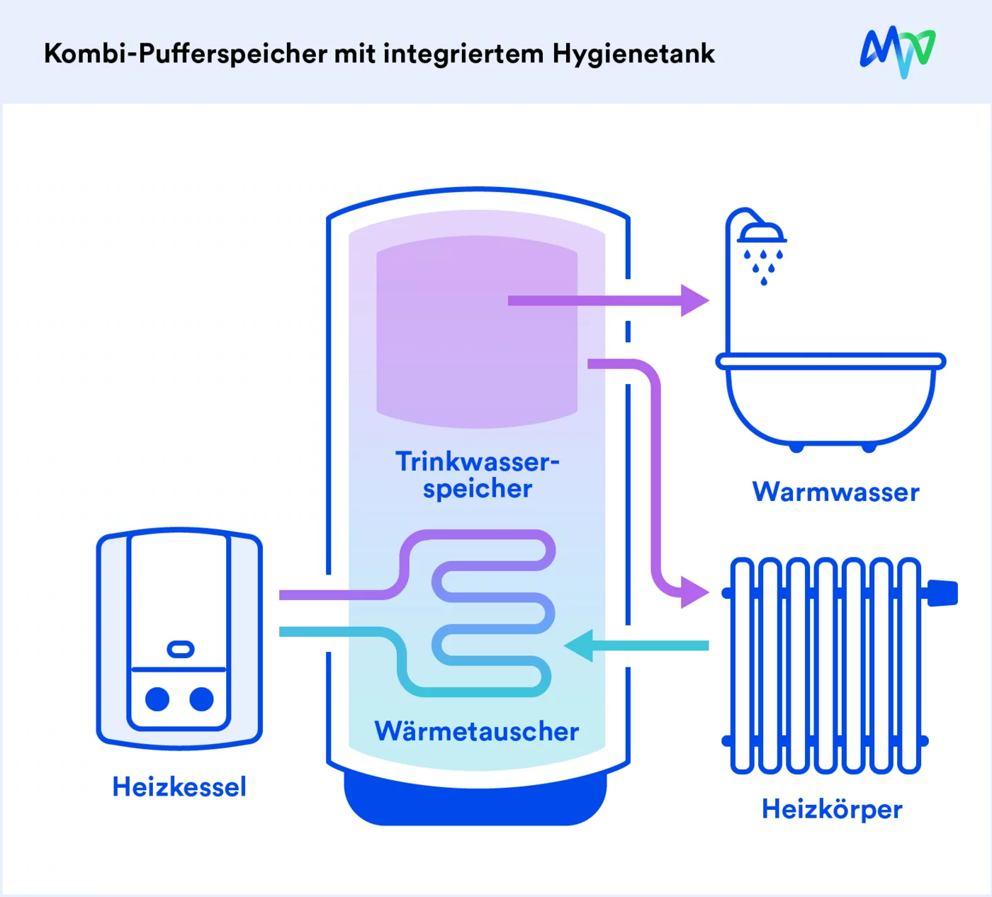 Kombi-Pufferspeicher mit integriertem Frischwassertank: Bei dieser sogenannten Kombispeicher-Lösung wird das Trinkwasser in einem separaten Hygienetank vorrätig gehalten, der sich innerhalb des Heizungswassertanks befindet.