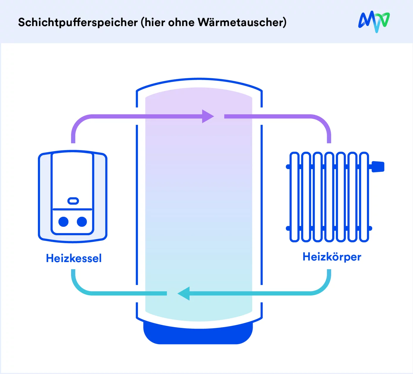 Schicht-Pufferspeicher: Dieser Speichertyp schichtet das Heizungswasser temperaturabhängig statt es bei einer gleichmäßigen Mischtemperatur zu halten. Die Durchmischung der Temperaturschichten wird auf natürliche Weise vermieden, weil das leichtere, heiße Wasser oben und das schwerere, kalte Wasser unten zirkuliert. So bleibt die Wärme dort erhalten, wo sie gebraucht wird – was sich positiv auf die Energieeffizienz auswirkt. Schicht-Pufferspeicher gibt es, wie Standard-Pufferspeicher, mit und ohne Wärmetauscher. Einige Modelle besitzen zwischen dem Warm- und dem Kaltwasserbereich eine zusätzliche physische Trennschicht.