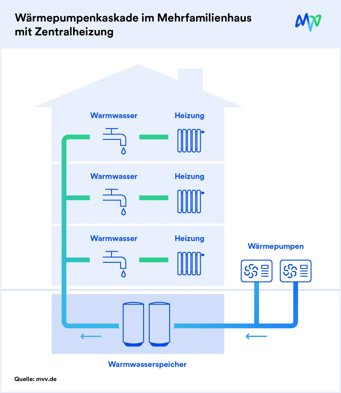 Die MVV bietet Luft-Wasser-Wärmepumpen in Kaskadierung für die Beheizung von Mehrfamilienhäusern mit Zentralheizung an. Der Aufbau entspricht dem exemplarisch dargestellten Prinzip: Die Außeneinheiten der Wärmepumpe werden an geeigneter Position außerhalb des Mehrfamilienhauses aufgestellt. Sie erzeugen zusammen das erforderliche Warmwasser zur Beheizung und Trinkwarmwasserversorgung.