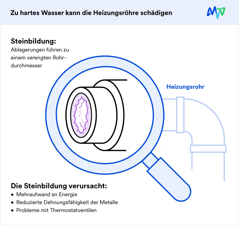 Im Wasser enthaltene Mineralien wie Kalzium und Magnesium können sich mit der Zeit als Kalk in den Leitungen des Heizungssystems ablagern. Durch diese sogenannte „Steinbildung“ verringern sich die Rohrdurchmesser, was einen höheren Energieverbrauch zur Folge hat. Schon eine ein bis zwei Millimeter dünne Kalkschicht kann den Energieverbrauch einer Heizungsanlage um bis zu 15% in die Höhe treiben. Zudem können sich Teile der Ablagerungen lösen und Schäden z.B. an Thermostatventilen verursachen. Auch die Dehnungsfähigkeit des Metalls wird durch den Kalkbesatz verringert.
