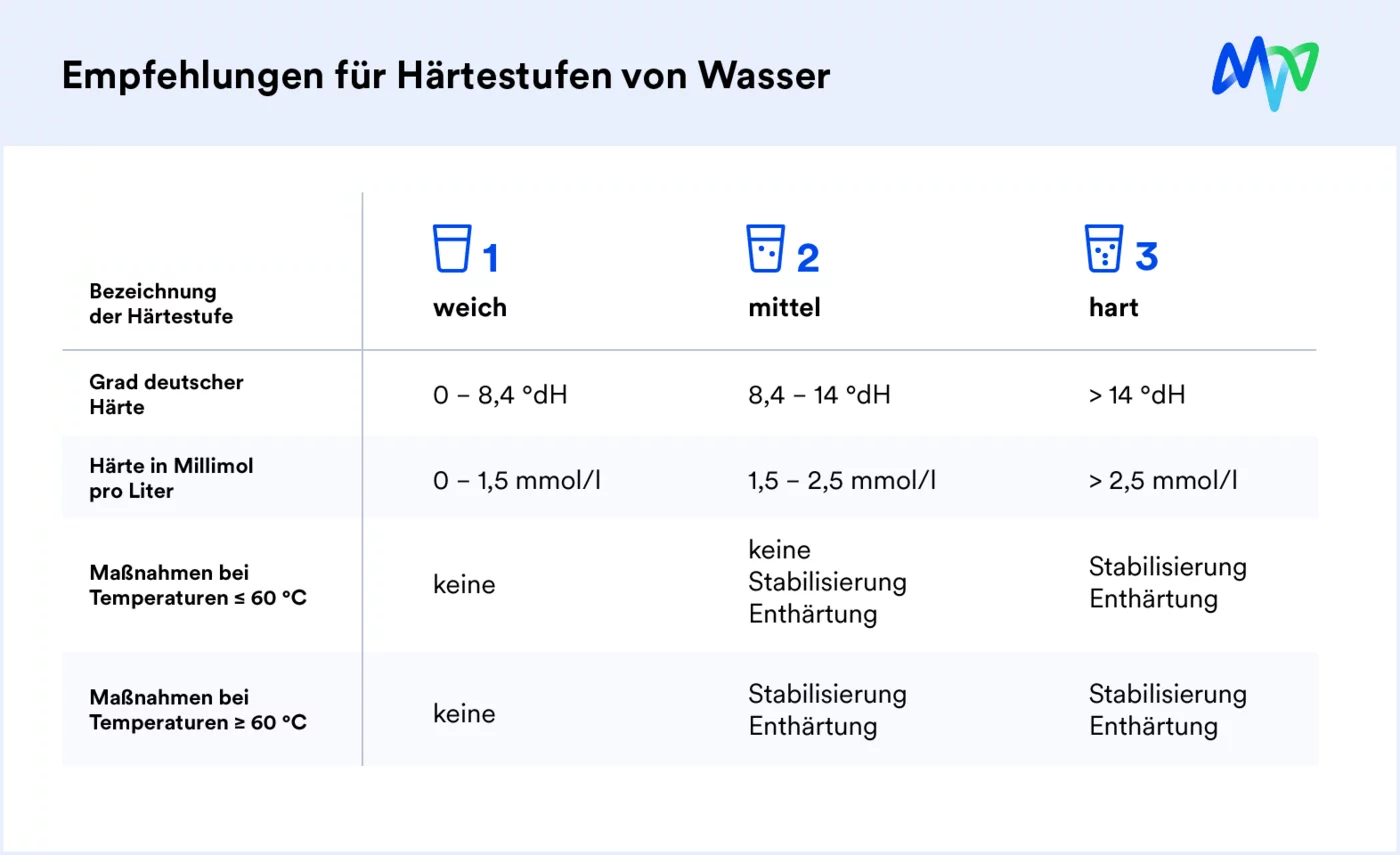 Wie hart das Trinkwasser an Ihrem Wohnort ist, erfahren Sie bei Ihrem Wasserversorger. Im Versorgungsgebiet der MVV beträgt die Wasserhärte beispielsweise 20°dH und ist damit dem Härtebereich 3 (hart) zuzuordnen. Die Wasserhärte kann sich dabei je nach Bodenschichten selbst in Nachbargemeinden unterscheiden.
