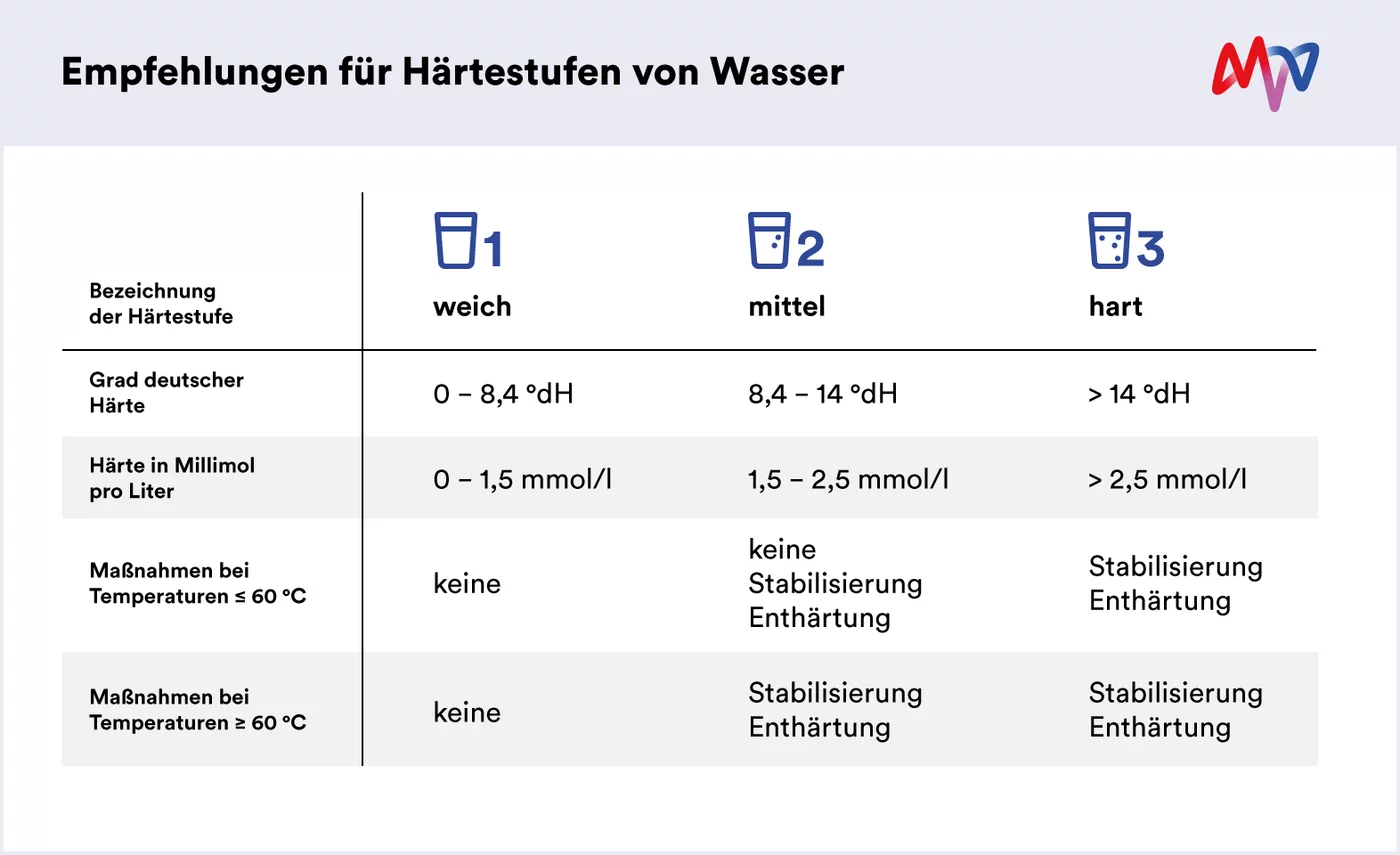 Das Regenwasser reichert sich auf dem Weg durch das Erdreich bis ins Grundwasser mit vielen Mineralien an, zu denen auch Calcium und Magnesium gehören. Das Wasser, das im Wasserwerk durch Brunnen an die Oberfläche gepumpt wird, enthält entsprechend mehr oder weniger große Konzentrationen an Calciumcarbonat, die in Millimol/l gemessen werden und den Härtegrad bestimmen. Dabei ist die Wasserhärte kein Qualitätsmerkmal, sondern spiegelt nur die Geologie im Einzugsgebiet des Wasserwerks wider. Die Skala reicht von weich über mittel bis hart.