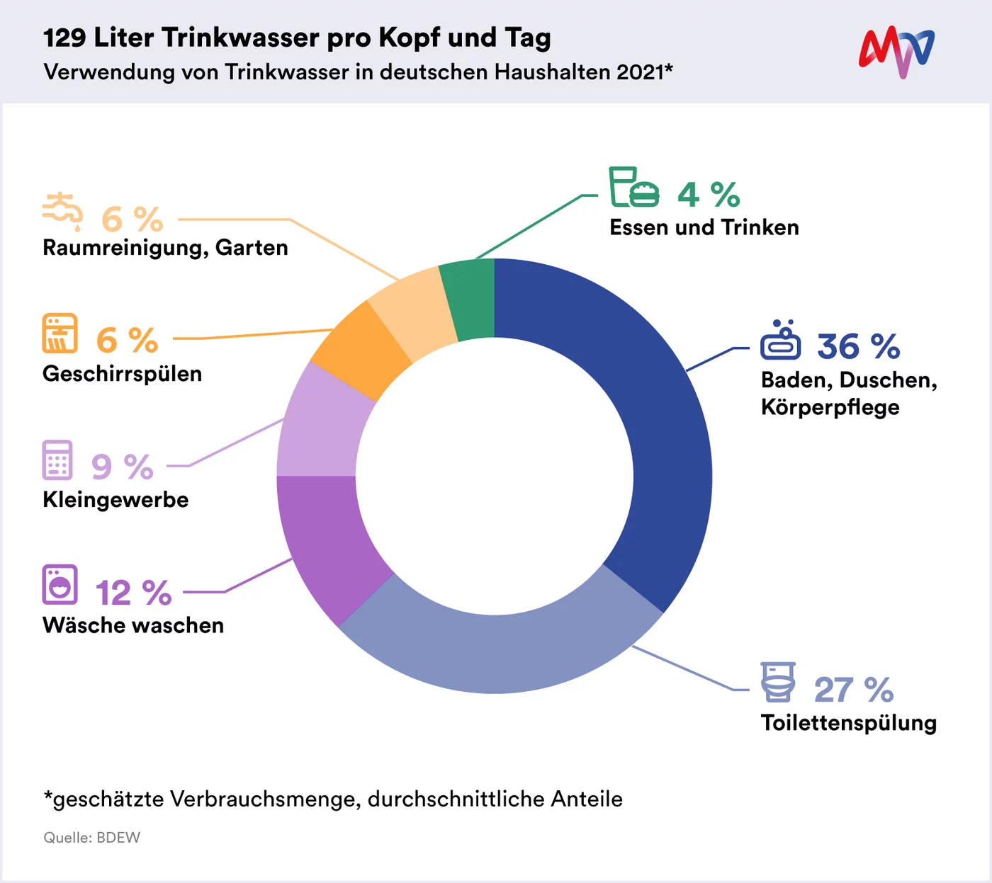 „Lass das Wasser nicht unnötig laufen!“ – diesen wohlgemeinten Hinweis hat sicher jeder von uns schon einmal gehört. Dabei hat sich der Pro-Kopf-Verbrauch in den letzten Jahren nicht sehr geändert: 129 Liter Trinkwasser am Tag waren es 2021 pro Person in Deutschland – etwa eine Badewanne voll. Damit liegen wir im europäischen Vergleich im Mittelfeld.
